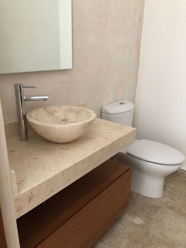 sala, comedor, medio baño de visitas, cocina con alacena cerrada, cocineta con gavetas de madera, de Parota y acabado blanco brillo; meseta de granito blanco, tarja y llave Teka; estufa de gas marca Koblenz, modelo EK-615 Provence, campana marca Teka modelo DJE90